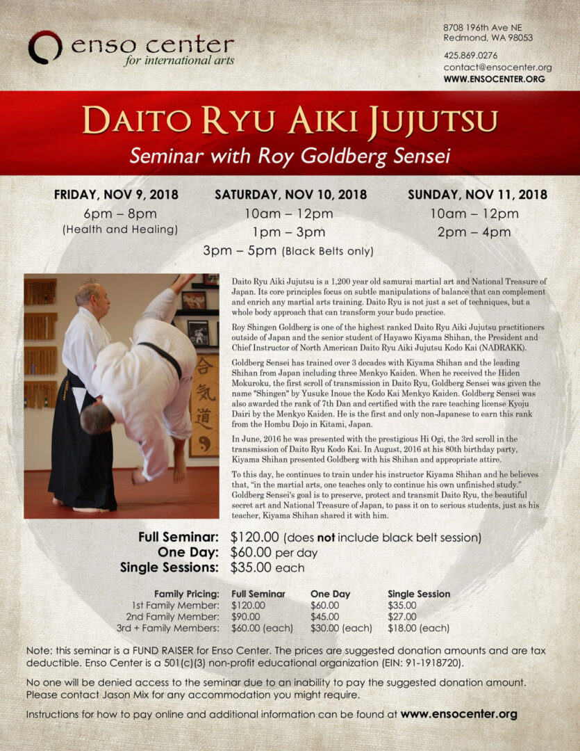 Daito Ryu Aiki Jujitsu Seminar With Sensei Goldberg By pwsadmin | October 10, 2017 We were fortunate to have Sensei Roy Goldberg from Albany, New York teach a daito-ryu aiki jujitsu seminar at our dojo. Posted in Events and tagged Seminars
