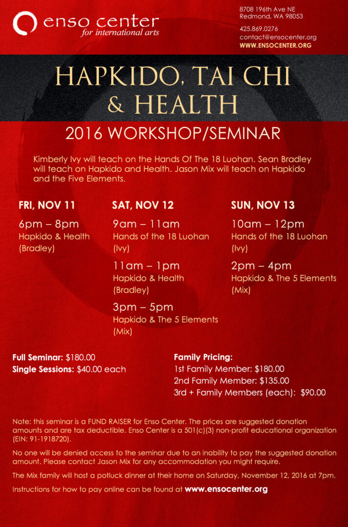 Martial Arts and healing have a long history together. In this seminar Masters; Jason Mix, Sean Bradley and Kim Ivy explored this theme. Kim Ivy taught 18 Hands of Luohan, Sean Bradley taught Hapkido and Health and Jason Mix taught Hapkido and the 5 Elements.