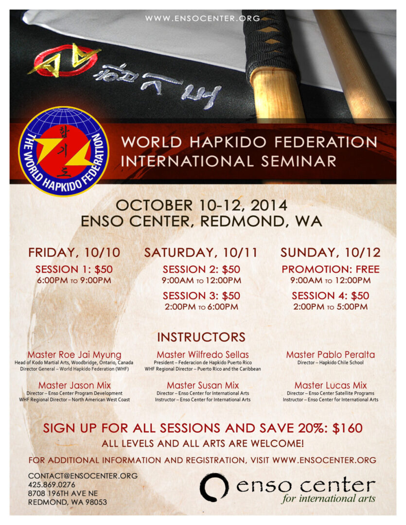 We hosted the North American World Hapkido Federation seminar featuring Master Roe Jai Myung of Canada, Masters Jason Mix, Susan Mix, and Lucas Mix of Enso Center, Master Sellas of Puerto Rico and Master Peralta of Chile.